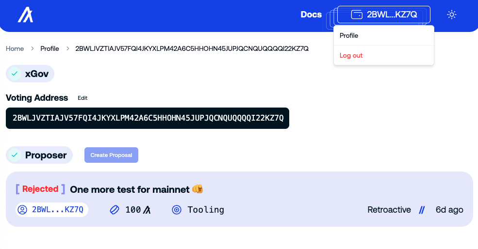 In your profile page, you’ll see your xGov status. The green tick above your voting address means the address is enrolled.