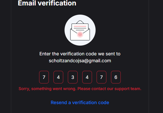 Hi, now it looks like i cannot pass the email validation phase. When i submit the correct code which arrives to the email, it makes the numbers red and writes error “Sorry, something went wrong. Please contact our support team.”